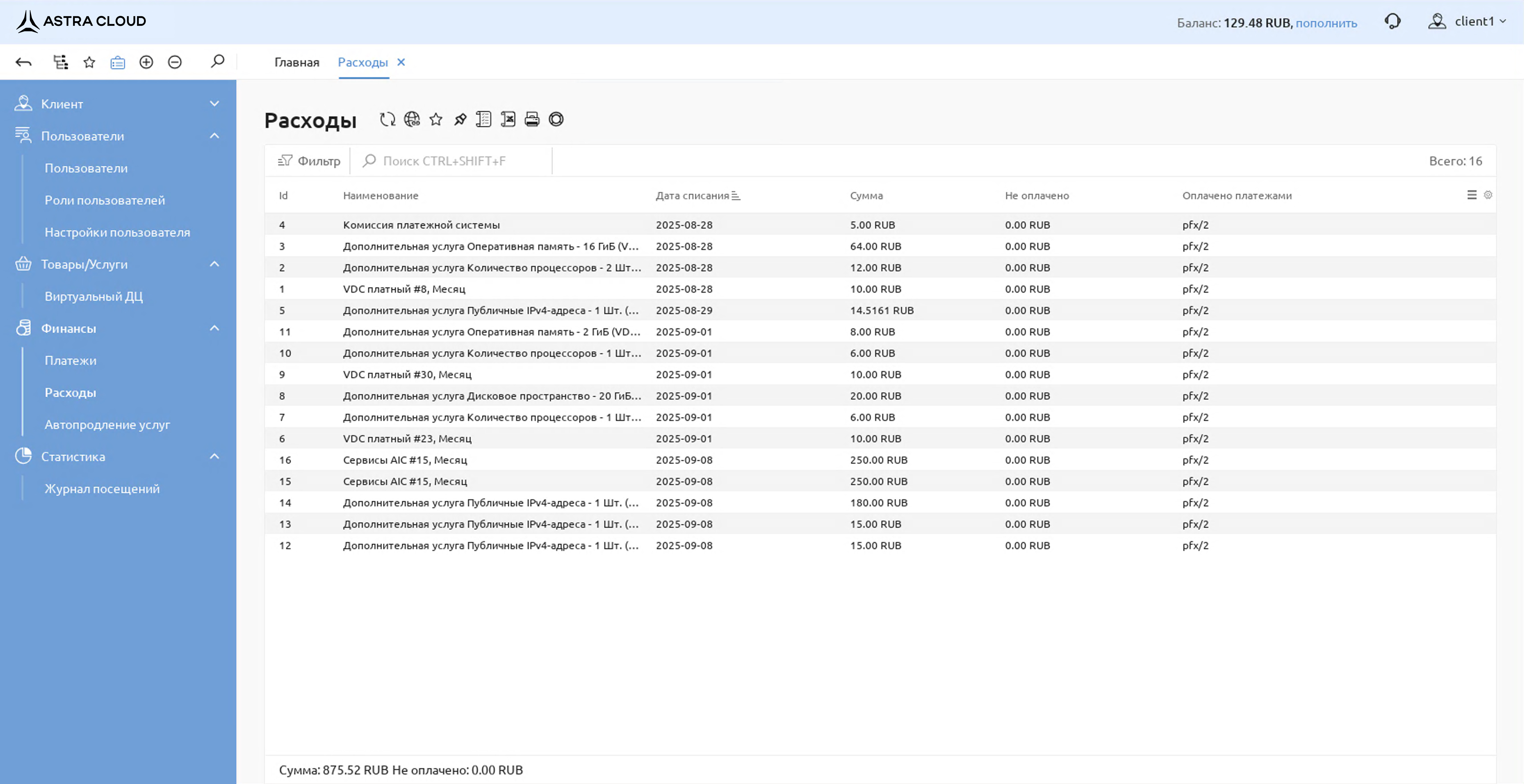 4. Кабинет пользователя. Контроль расходов.